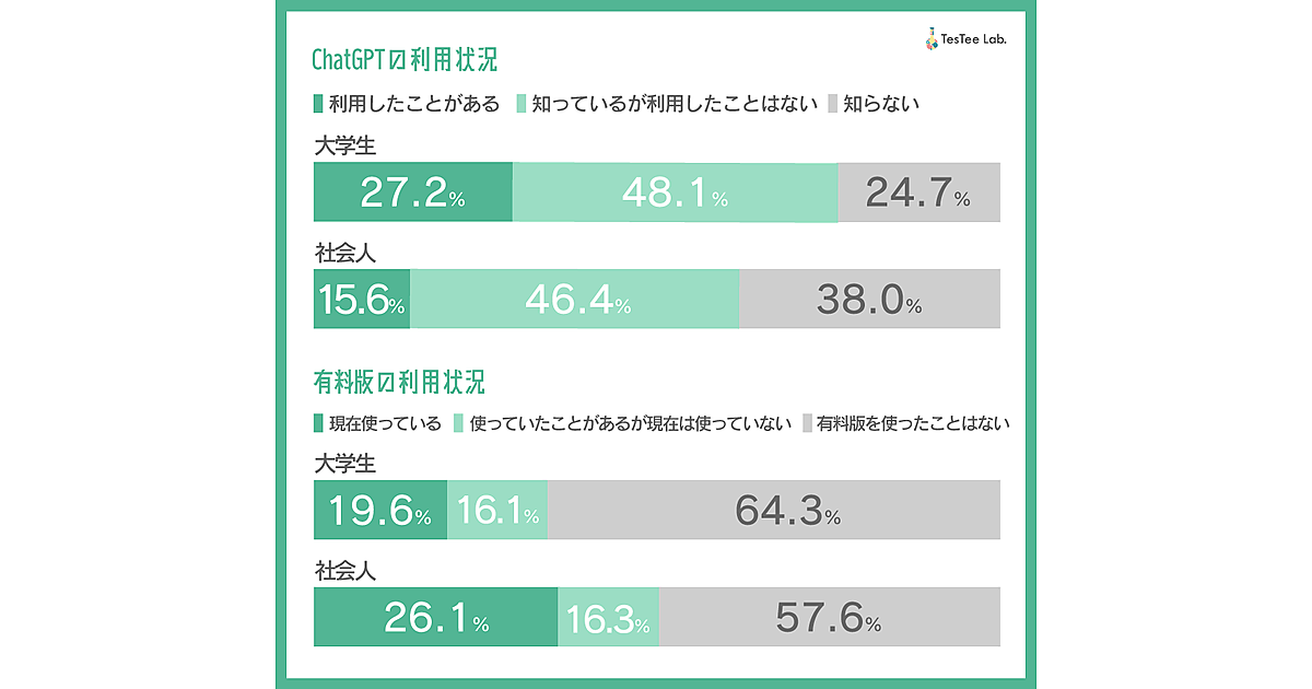 2023年8月に行った日本人への調査でも、大学生の7割がChatGPTを認知していて、2割が利用していると回答をしています。