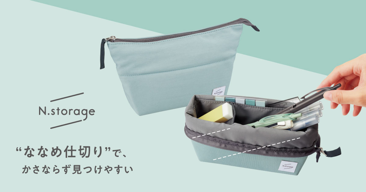 ペンを斜めにして収納することができる「ななめ仕切り」が特徴的なペンケースです。